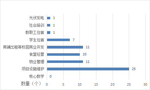 按照項目公司運營內(nèi)容是否包含教學內(nèi)容等核心業(yè)務,公立高等學校PPP項目可以分為兩類。實踐中,由于高校教學任務的特殊性、專業(yè)性以及教育領域企業(yè)傾向于輕資產(chǎn)運營等原因,較多公立高等學校PPP項目核心教學任務由學校開展,非核心教學內(nèi)容交由項目公司負責。全國PPP綜合信息平臺管理庫顯示共有25個高等學校PPP項目進入執(zhí)行階段并滿6個月(此時可對外公示項目實施方案等信息),其項目運營維護內(nèi)容集中于項目設施維護、物業(yè)管理、食堂經(jīng)營、學生住宿和商鋪出租等商業(yè)開發(fā)。