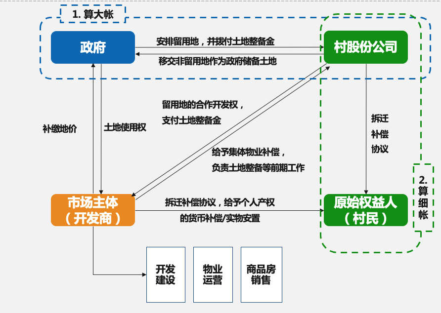 (3)留用土地由開發(fā)商和村股份公司合作開發(fā),開發(fā)商補繳地價后負(fù)責(zé)項目范圍的征地拆遷、土地平整以及留用地的開發(fā)建設(shè)、物業(yè)運營和商品房銷售等,而村股份公司可按照留用地土地價值占比參與開發(fā)收益分成。非留用地全部移交政府管理,作為政府儲備用地,后續(xù)可用于基礎(chǔ)設(shè)施建設(shè)或土地出讓。