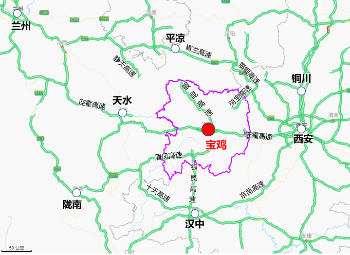 寶雞古稱陳倉,地處關中平原西部,是我國亞歐大陸橋上第三個大十字樞紐和全國性綜合交通樞紐城市之一。為發(fā)揮交通運輸對寶雞經(jīng)濟和關中平原城市群發(fā)展的先導性和支撐作用,寶雞市政府出臺《關于加快構建全國性綜合交通樞紐的意見》,提出到2025年末要建成“內(nèi)通外聯(lián),公鐵互補、空地立體、銜接順暢”的全國性綜合交通樞紐,市域范圍規(guī)劃形成“三橫兩縱兩環(huán)”高速公路網(wǎng)。